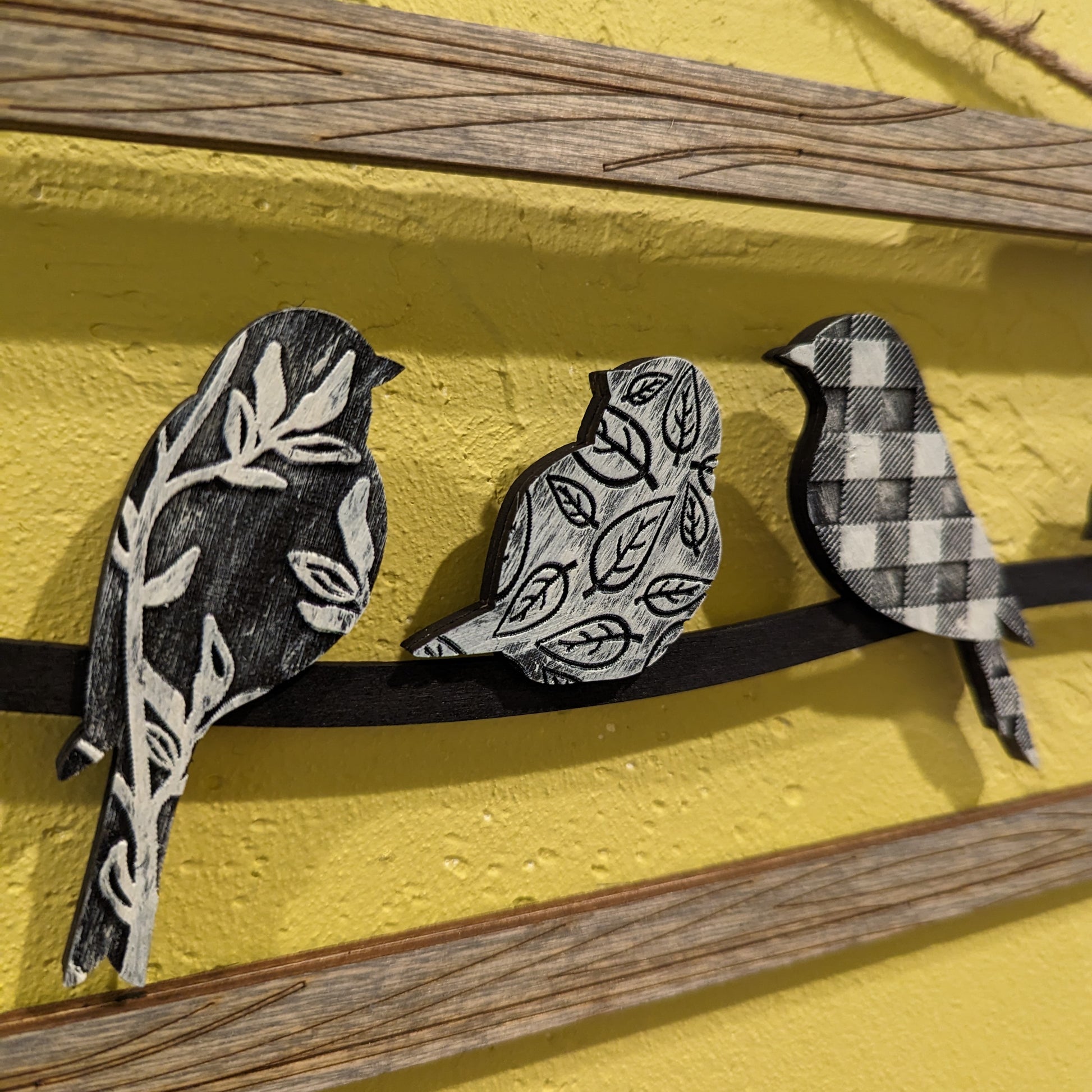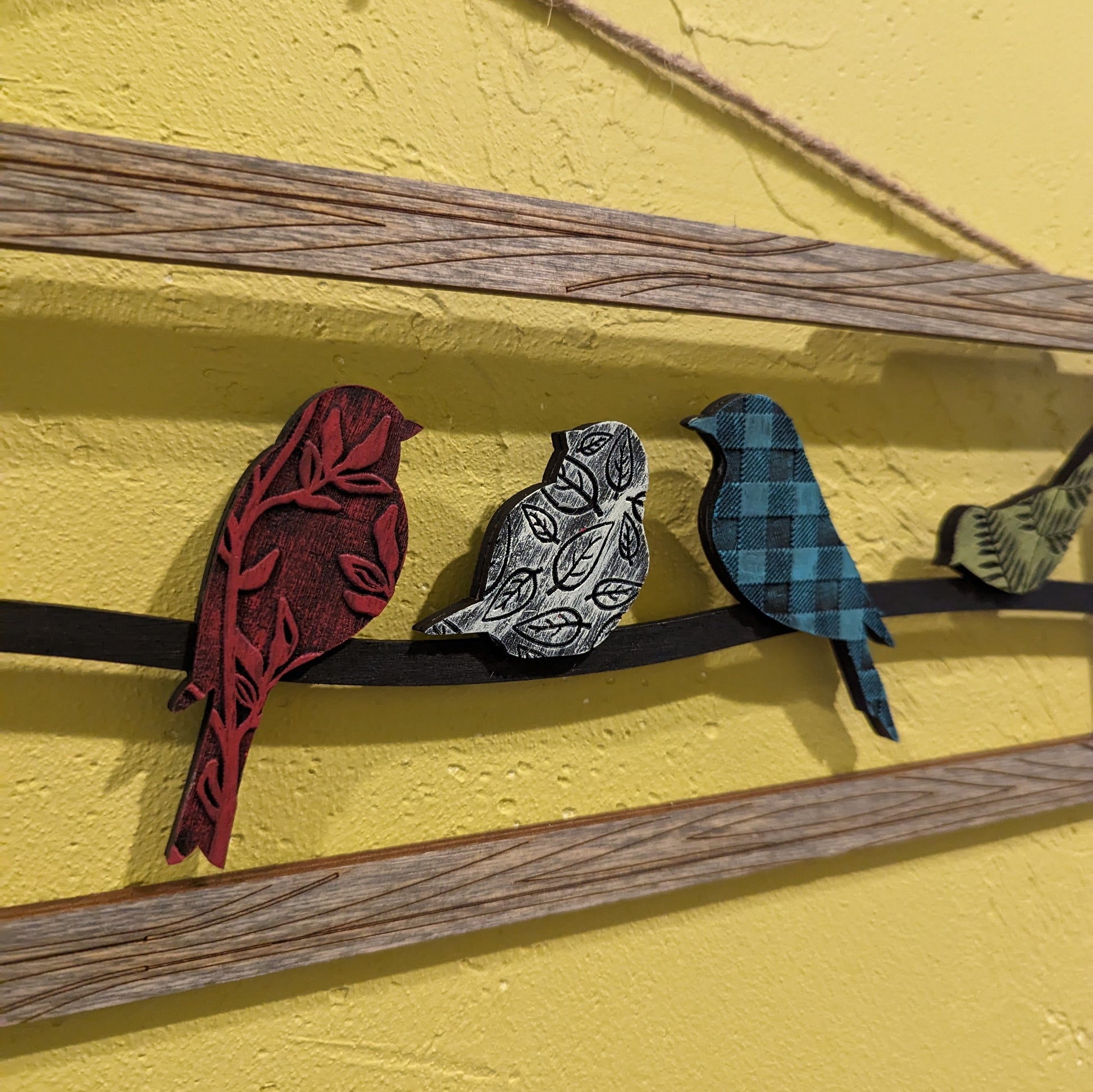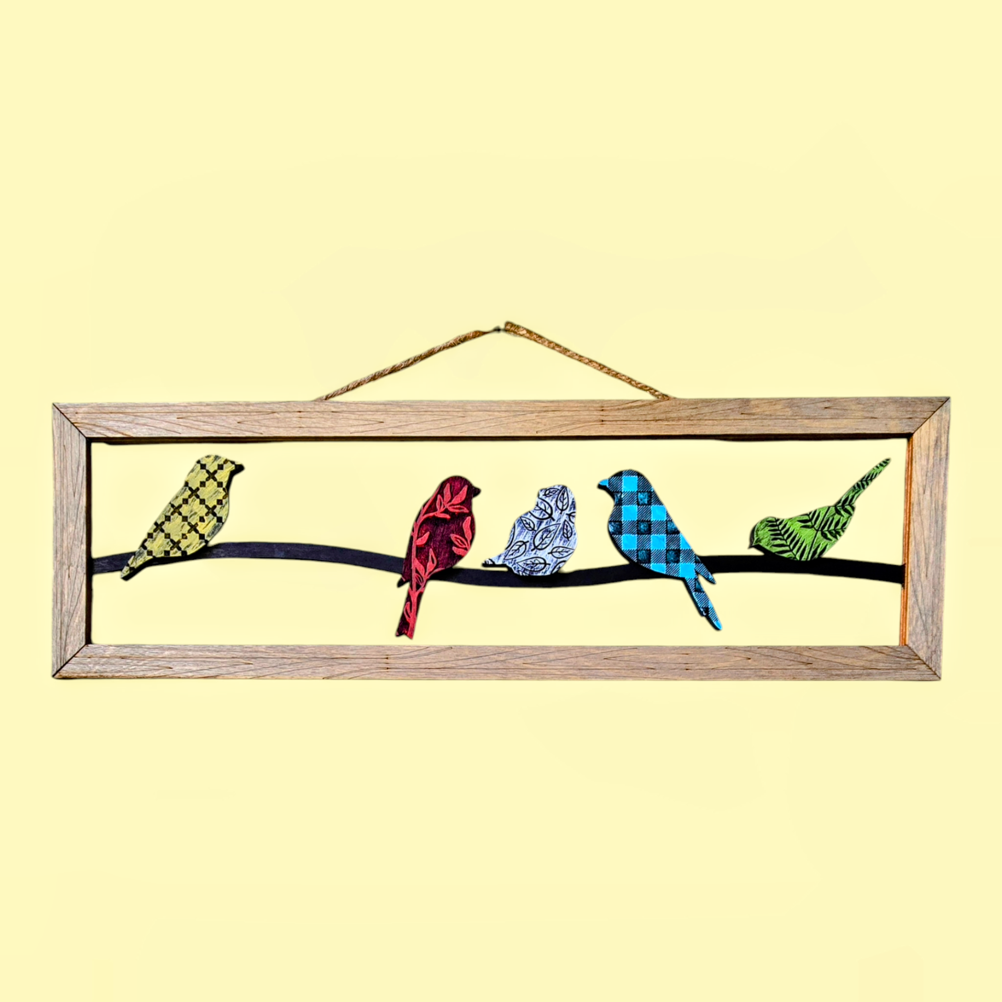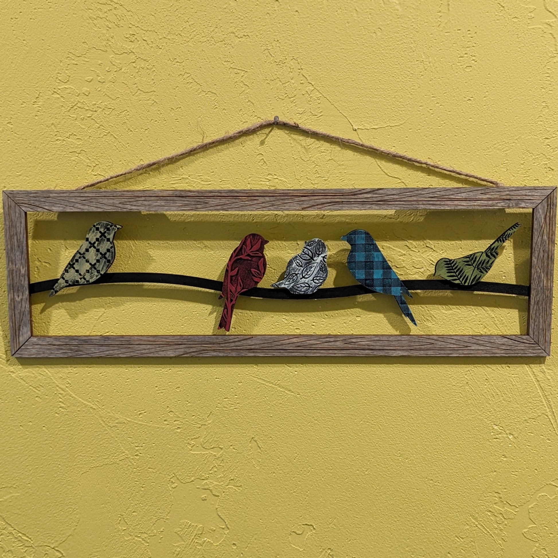 Birds on a wire rectangle wall art. Featuring 5 colorful birds sitting on a wire. Perfect for anyone who loves a bluebird, cardinal, or yellow finch.