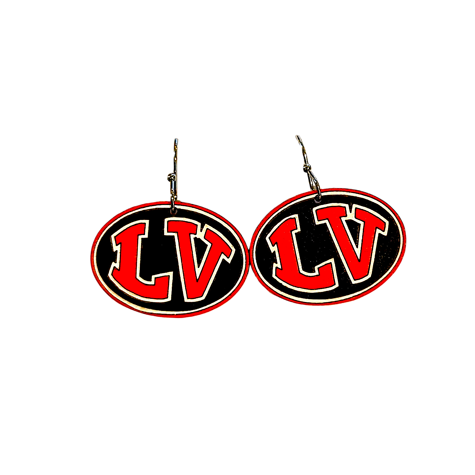 Ligonier Valley School Disitrict logo dangle earrings are a perfect way to show your school spirit! Ligonier, PA. Hand painted in red, black and white colors. The back is stained in golden oak.